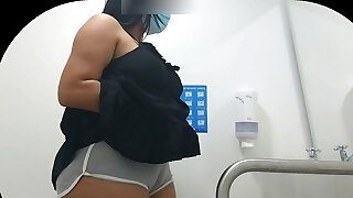 CAMERA CAPTURING CAMELTOE OF Chick WITH BIG Caboose IN PUBLIC BATHROOM
