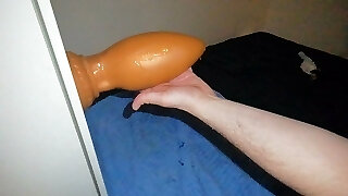 Crazy girl tries to ride fake penis of incomprehensible size with her tight pussy