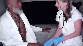 Alanah Rae naughty nurse does a close exam of Bill Bailey's huge cock, and needs to feel it inwards her taut cage