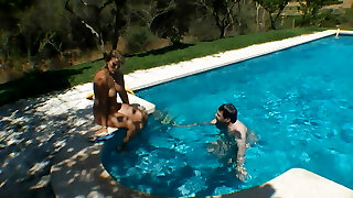 Poolside threesome for two ultra-cute nymphs and one lucky big dick guy