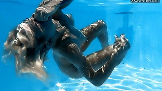 Two beautiful girls swimming naked in a pool