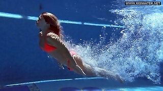 Sizzling redhead model Marketa swimming naked in a pool