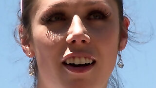 A smoking hot brunette cutie in a bikini gets interviewed and rammed hard