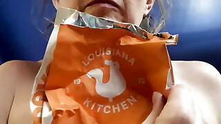 Convenience eating! Heartbroken Rachel Wriggler fights to hold back the tears as she gobbles Popeyes for breakfast at 6pm