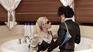Towheaded and the dark-haired babe having a good time in the bathtub