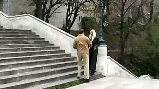 Blonde long-haired babe rubs her nub and pees on the stairs