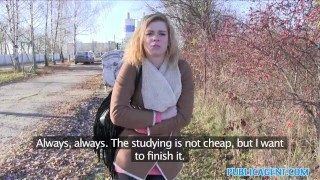 Public Agent Molten Lost blonde sucks stranger’s cock for currency
